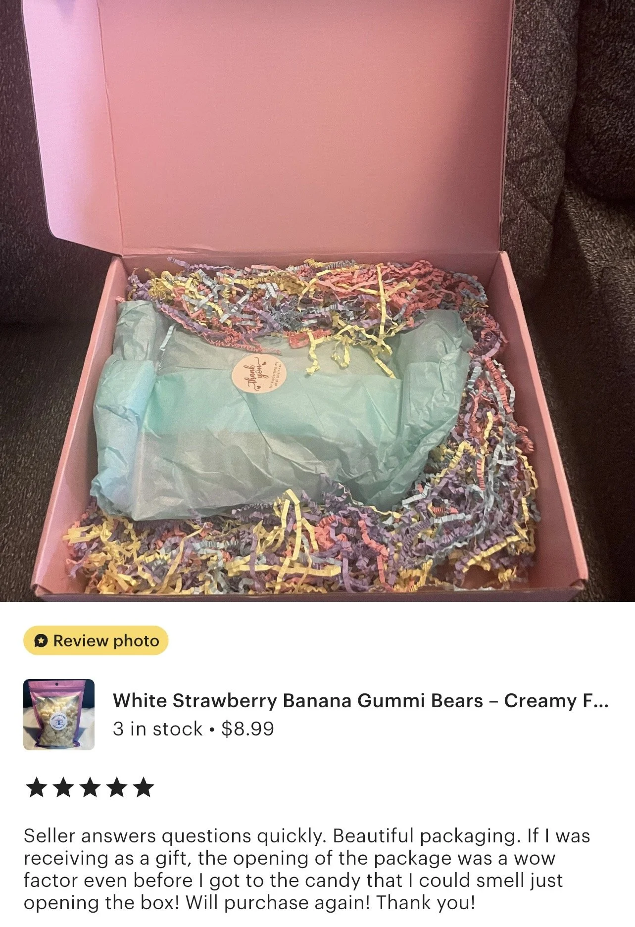 “Seller answers questions quickly. Beautiful packaging. If I was receiving as a gift, the opening of the package was a wow factor even before I got to the candy that I could smell just opening the box! Will purchase again! Thank you!”